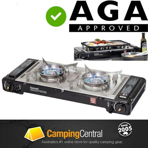 The Gasmate Travelmate II Deluxe Twin Stove with Hotplate is a highly efficient outdoor butane gas cooking stove that comes complete with a reversible, non-stick, cast aluminium hotplate. The full stainless steel body ensures durability, long life and excellent performance
