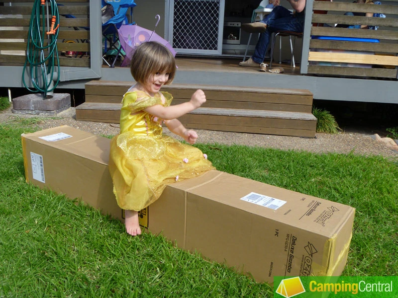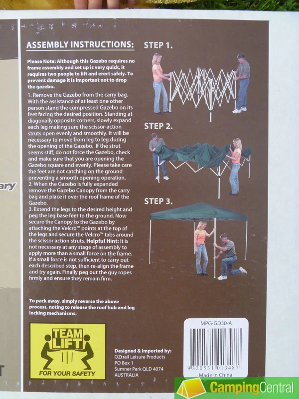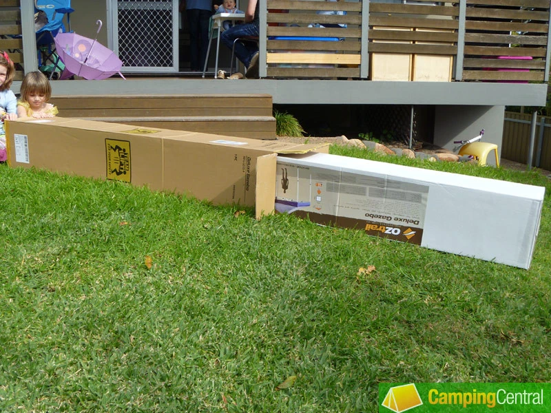 I ordered the OZtrail Deluxe Gazebo on Tuesday afternoon – a run-of-the-mill, complication free ordering process, paying through PayPal. Early Friday afternoon a courier delivered it. Just one courier mind you, despite the clearly indicated ‘team lift’ recommendation. One long, thin cardboard box. Quite heavy – about 20kg according the web site, which sounds about right.